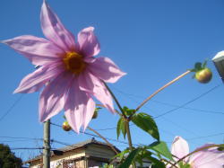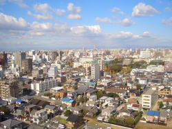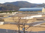 写真左中央の建物は東高森台小学校の体育館、中、左の山は道樹山、右の空色の建物は東高森台小学校の体育館です。