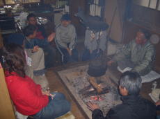 そこで宿泊はコタツのある建物で車座になって床を敷きますが、搗いた餅が置いあったりしてあって十分スペースが取れません。