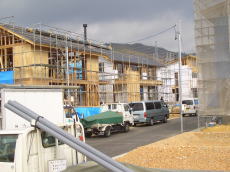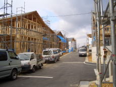 柱が建ち、壁が貼られだすと道路が狭く感じられます。