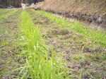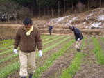 毎年この1月と2月は名古屋市内より数度気温の下がる瑞浪・日吉である。 参加を迷っていた方には春暖かくなってからにしてください、もちろん真っ白な霜の降りた田圃や畑をみたい、囲炉裏を囲んで一杯やってみたいというのなら別ですがと知らせておいた。 春にしますとの返事であった。 例年程の寒さではなかった。 初日は今年の計画を決めた。 畑は新たに一畑増やした。 昨年開墾はしたが使用しなかったところである。 肥やしが不要というか、肥えた土地でないほうが良いと言う「豆」を蒔くことにした。 昨年、思いのほかの小豆の収穫となったY氏が中心で実施と決める。 後は、連作にならぬように配慮して「ジャガイモ」「サトイモ」「サツマイモ」と芋類を一畑づつにして、他の野菜類は例年通りとした。 と言っても野菜畑は広いので連作になる心配はない。 お米は昨年同様に「うるち米」を約一反、「モチ米」を4畝とした。 田はそれぞれ昨年「牧草地」「麦とジャガイモ」「米」を植えた場所で、異なる条件のところで3毛循環連作の実験も加味してある。 明けて23日は麦踏である。 他は切り倒したままになっていた檜を前庭に運ぶ作業と薪の整理をしました。 大寒期なのに畑に残っていたダイコン、人参、水菜、白菜、モチ菜、など新鮮野菜の枯れるときにお土産がいただけた。 踏んだ後の麦 踏む前の麦の列 ![]() 意識して撮影したわけではありません、間違って撮ったのですが、なんとなく麦踏の感じが出ていると思いませんか? (思わない、すいません)