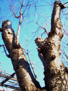春、花満開の草木の様相も好きですが、大寒の中でスクッと寒風に身をさらしている木々も好きです。 ヤマザクラ 栗の木 ヤマザクラは栗の木と1メートルも離れておりません。 地表2メートルのところで2本に分かれておりました。 10年前でしょうか、思い切って頭というよりは胴のところからバサッときりました。「桜切る馬鹿、梅切らぬ馬鹿」といいますが、毎年淡い花びらをつけていましたが、その年から花をつけなくなったことは言うまでもありません。 しかし大枝からワキ芽が吹き出してきておりましたので、毎年剪定をしておりました、2年前からその枝先に花をつけるようになりました。 枯れた幹からはコケが生えてきております。 栗の木は敷地内には3分の1で、他は道路にはみ出しております。昨年末、はみ出していた枝を思い切ってきりました。 写真の大枝は敷地内にある1本です。 春になったらその花を紹介しましょう。