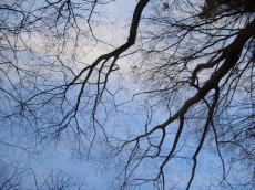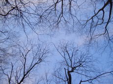NO179に掲載した我が家の庭の「冬枯れの木立」を見た後、散歩に出ました。 そこは春日井市の失われつつある草木を集めた”野草園”です。 広くはありません、やっと100坪というくらいでしょうか。 しかし、その野草園を囲い包むように「エゴの木」「ハンノキ」「ヤマザクラ」が林立しています。 自然の中で思いっきり枝を伸ばした木々が私も優しく包んでくれました。 新しく白ペンキで塗られたベンチに寝そべって、見上げて木立を撮影してみました。 築水池(用水池)から流れ出た水音が、微かに聞こえる小鳥のさえずりと”早く来い来い春”とメロデイーを奏でていると感じました。 野草園を出るとそこは廻間(はざま)の田圃が広がっています。 西に傾いた夕日が飛び込んできました。